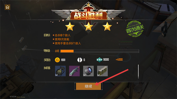 4、战斗胜利后,点击【继续】按钮,领取奖励并进入下一个界面或关卡,提升角色等级和实力。