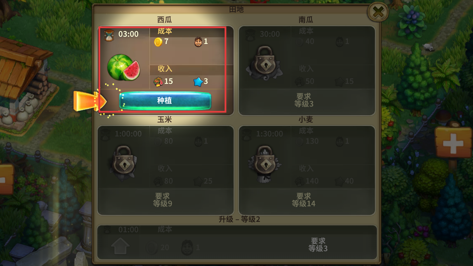 3、选择【西瓜】种植,消耗7金币1人口,3分钟收获15食物3星星,高效积累资源与星星。