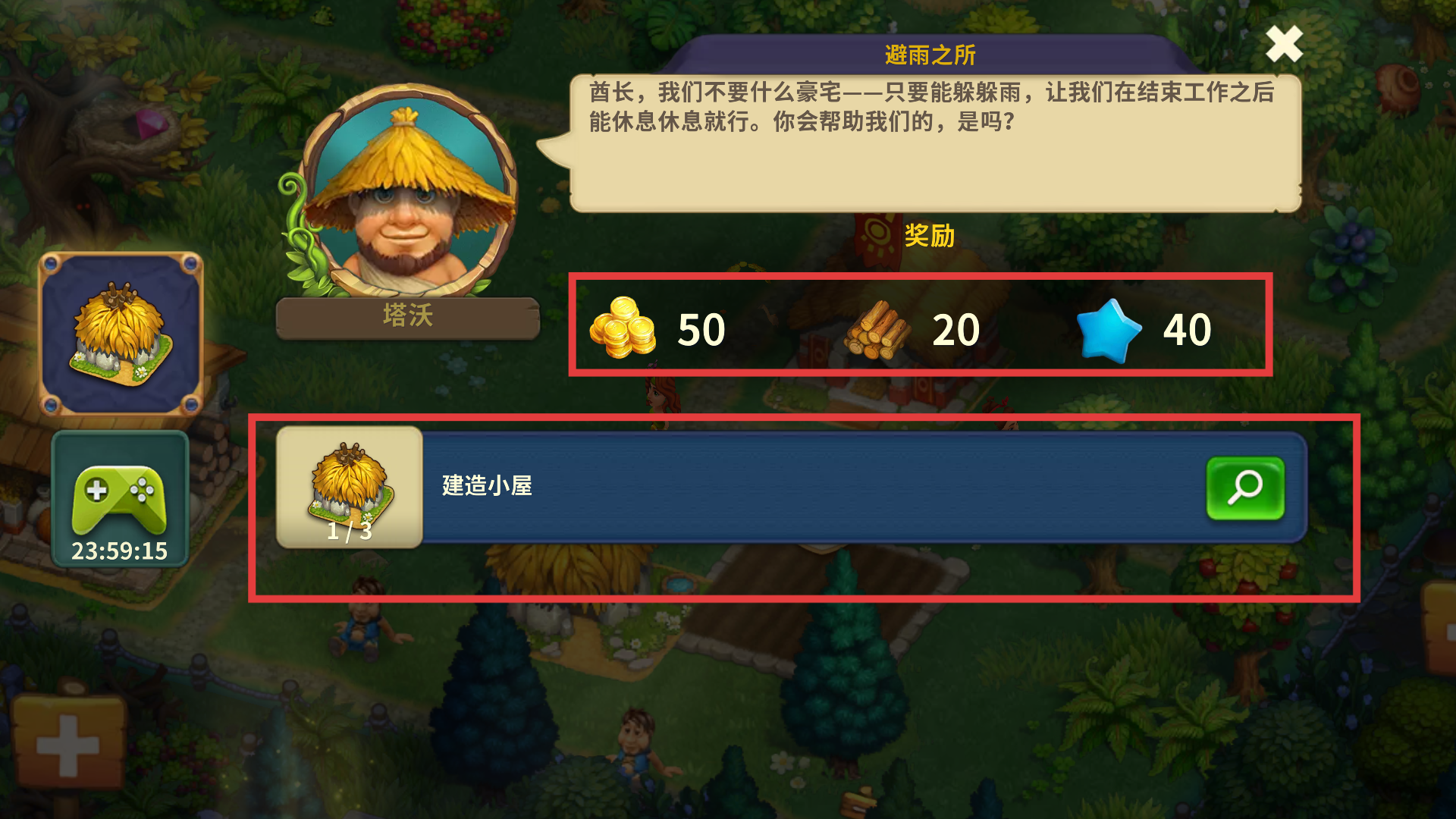 4、完成【塔沃】的建造小屋任务,可获得50金币20木材40星星奖励,快速推进部落建设进度。