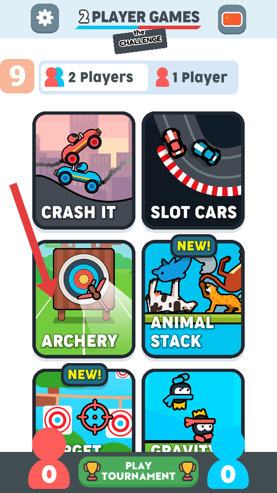 1、进入游戏界面后,点击【ARCHERY】图标,选择双人射箭游戏模式。