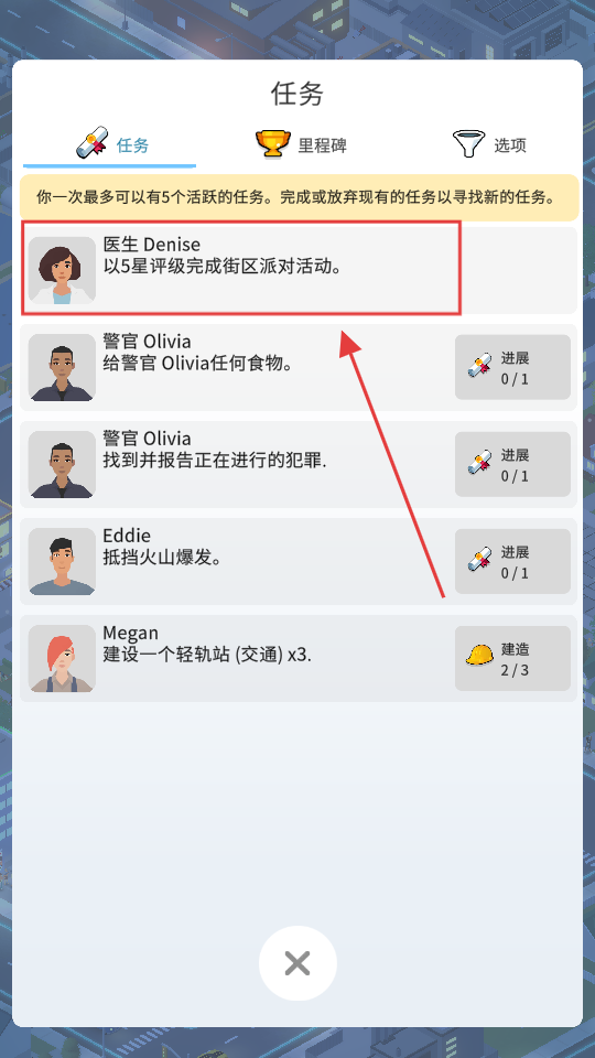 1、接受【医生Denise】的任务,需以【5星评级】完成【街区派对活动】,推进城市发展并提升市民满意度。