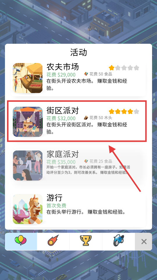 2、选择【街区派对】活动,花费【32000】金币与【50】木头,开启活动以完成对应任务目标。