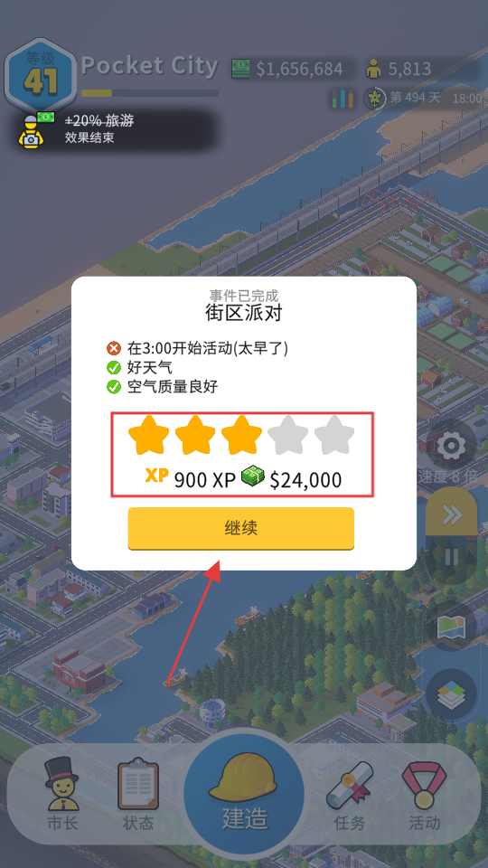 4、活动结束获得【3星】评级,领取【900XP】【24000】金币等奖励,点击继续回到城市界面。