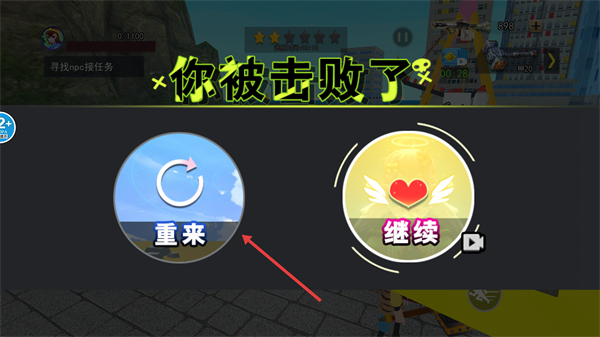 4、若战斗失败出现【你被击败了】提示,点击【重来】再次挑战。