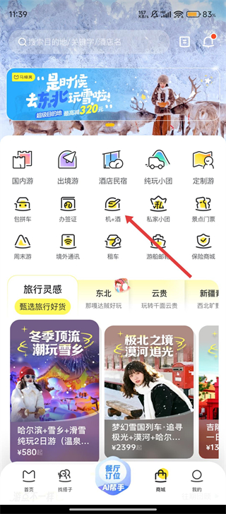 1、打开马蜂窝App,我们可以点击【机+酒】选项,进入对应功能页面哦。