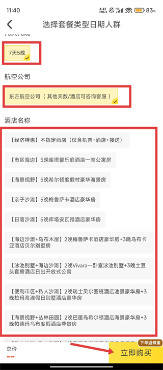 4、选好套餐,确定【7天5晚】等信息后,我们可以点击【立即购买】完成操作哦。