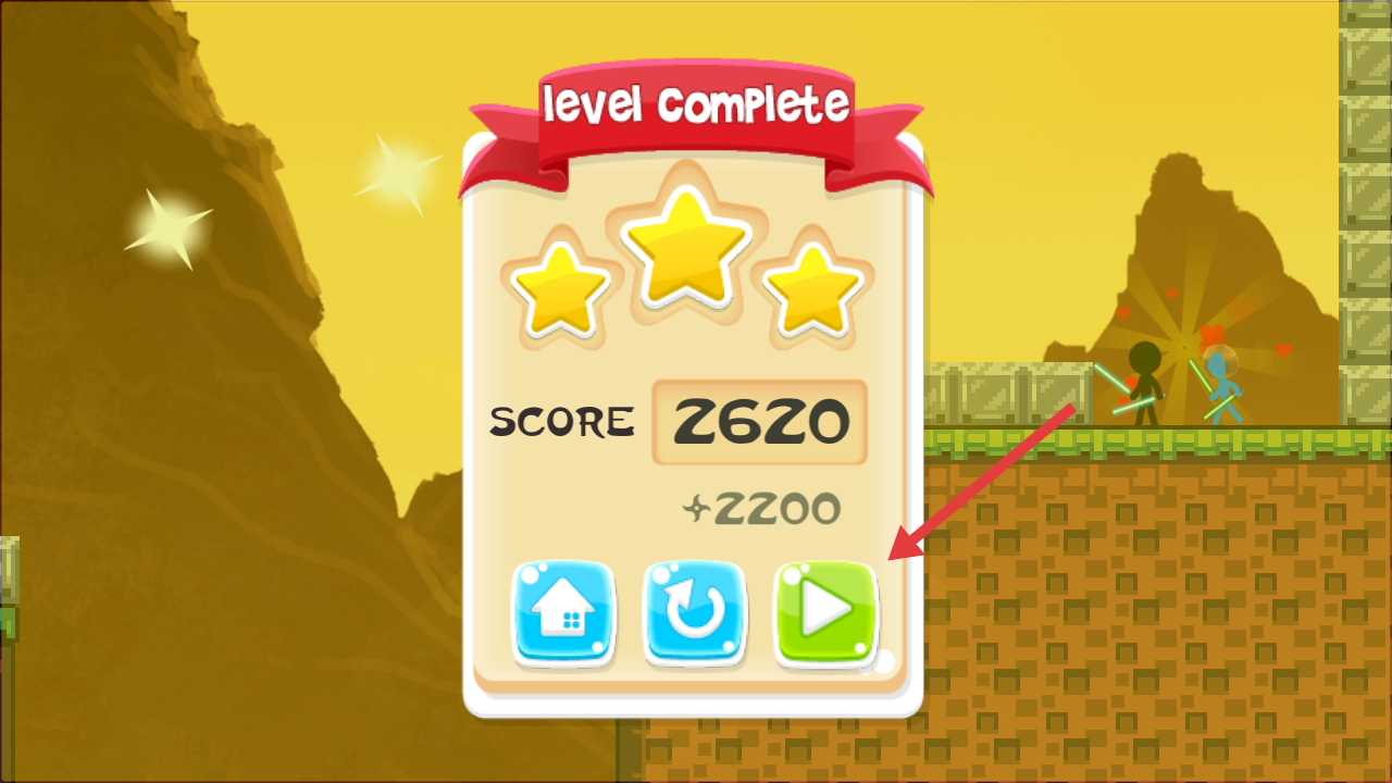 4、关卡完成后,点击绿色播放按钮进入下一关,继续挑战更多火柴人光剑战斗关卡。
