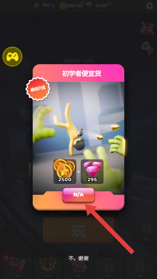 1、遇到“初学者便宜货”弹窗时,点击【N/A】直接领取奖励。