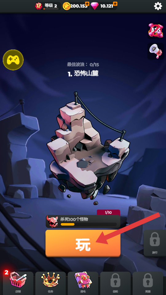 2、在“恐怖山麓”关卡界面,点击【玩】按钮,进入游戏战斗场景。
