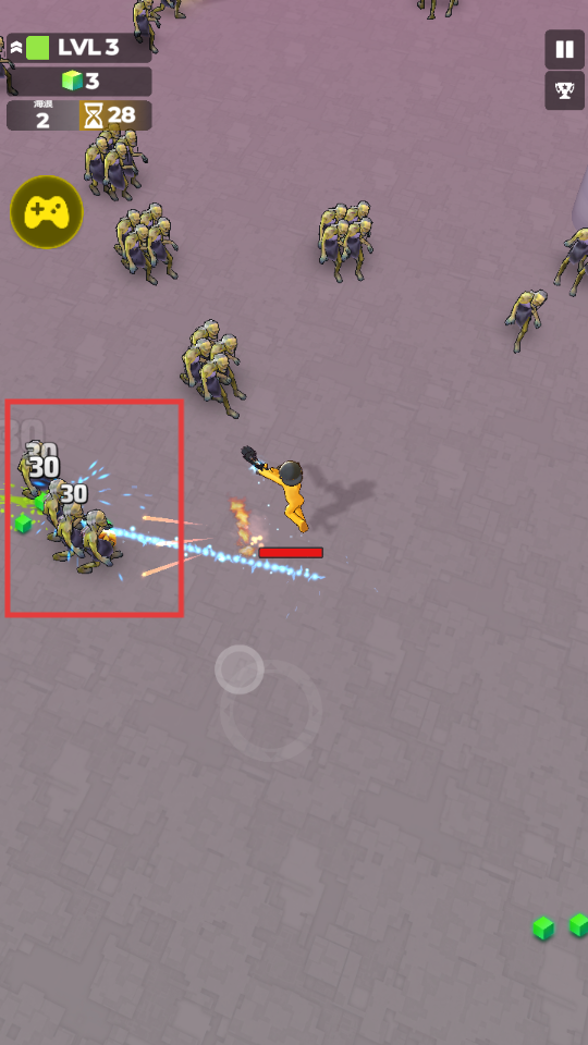 3、战斗时,角色会自动攻击怪物,可看到伤害数值(如30),消灭怪物获取资源。