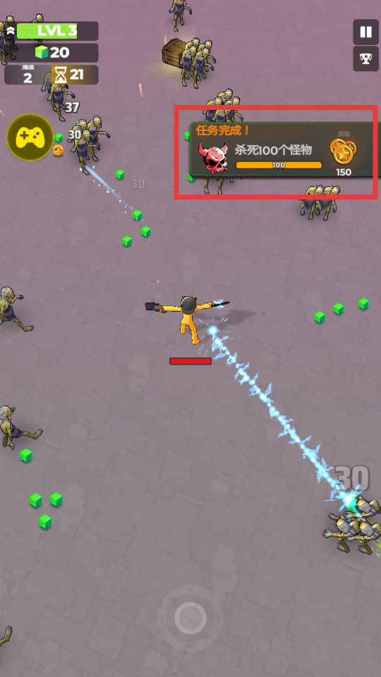 4、完成【杀死100个怪物】任务后,无需观看广告即可快速获取资源,推进游戏进程。