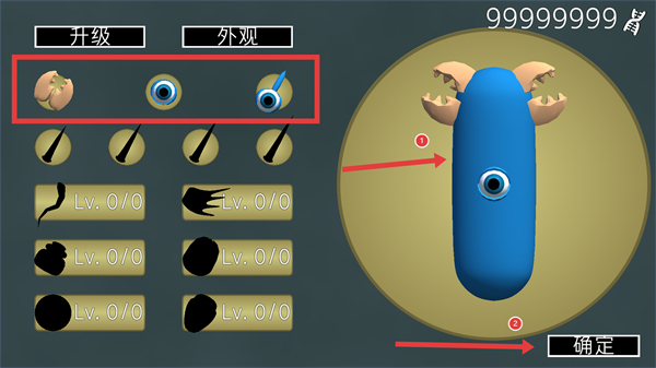 1、在【升级】界面选择肢体部件,搭配后点击【确定】,完成生物外观与能力的初始配置。