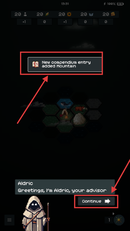 2、与顾问【Aldric】对话时点击【Continue】,解锁【Mountain】相关条目,获取更多生存探索的信息。