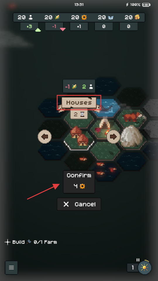 4、选择【Houses】后点击【Confirm】按钮,消耗4个【齿轮】完成建造,为部落居民提供居住场所。