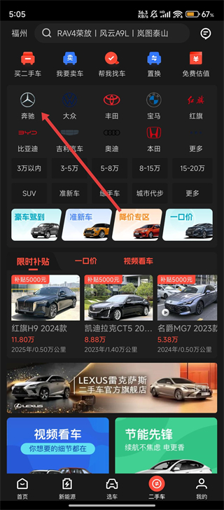 2、在二手车页,选择心仪品牌如【奔驰】,从众多品牌中精准定位,找车效率大大提升呢。