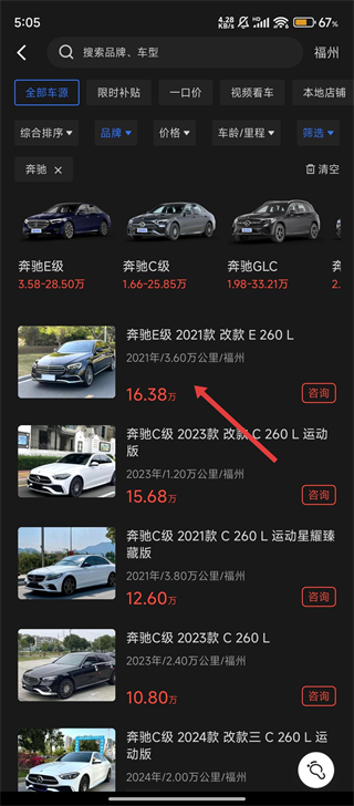 3、在品牌列表里,挑选具体车型如【奔驰E级-2021款-改款E260L】,查看车辆详细信息,了解车况很关键哦。