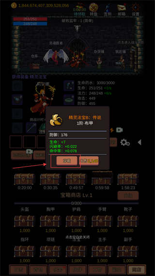 1、获得【精灵法宝B-传说-1阶布甲】后点击穿戴,可提升防御生命闪避率等属性,有效强化角色战斗能力。