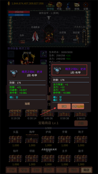 2、获得【精灵之铠A-史诗-1阶布甲】时对比当前装备属性,选择穿戴可增强防御与法力恢复能力。