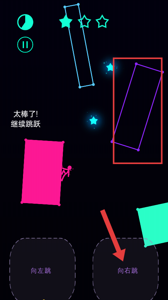 2、进入游戏后,依据提示【太棒了!继续跳跃】,通过点击【向右跳】按钮,操控角色跳跃至【红框】标识的方块上。