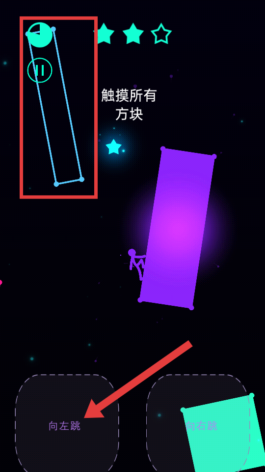 3、当看到提示【触摸所有方块】时,点击【向左跳】按钮,让角色触摸相应方块。