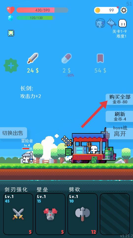 2、点击【购买全部】,花费金币获取道具,提升角色战力,助力冒险。