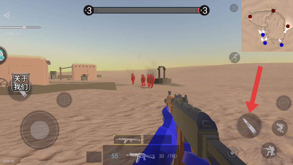3、看到敌人(红色角色)出现时,点击屏幕右侧类似【子弹】的射击按钮,操控角色开枪射击敌人。