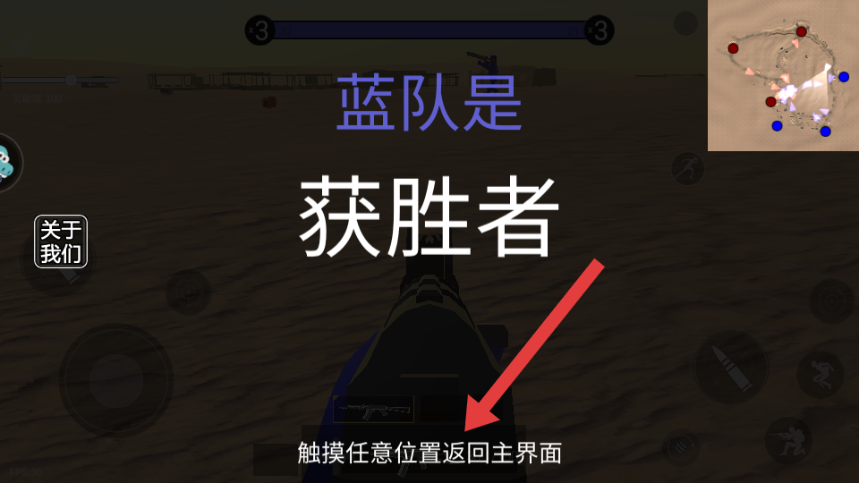 4、当显示【蓝队是获胜者】后,触摸屏幕任意位置,按提示返回主界面或进行下一局游戏。