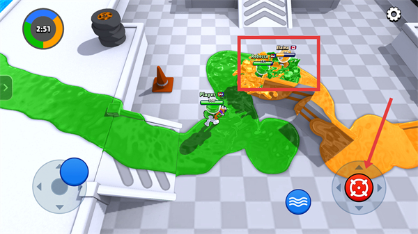 3、瞄准红框内的敌方角色,点击【红色按钮】喷射颜料,覆盖其染色区域。