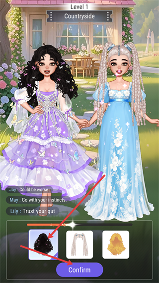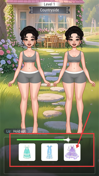 3、在【Level1】的【Countryside】场景中与对手pk,帮助角色选择紫色连衣裙为角色穿戴。