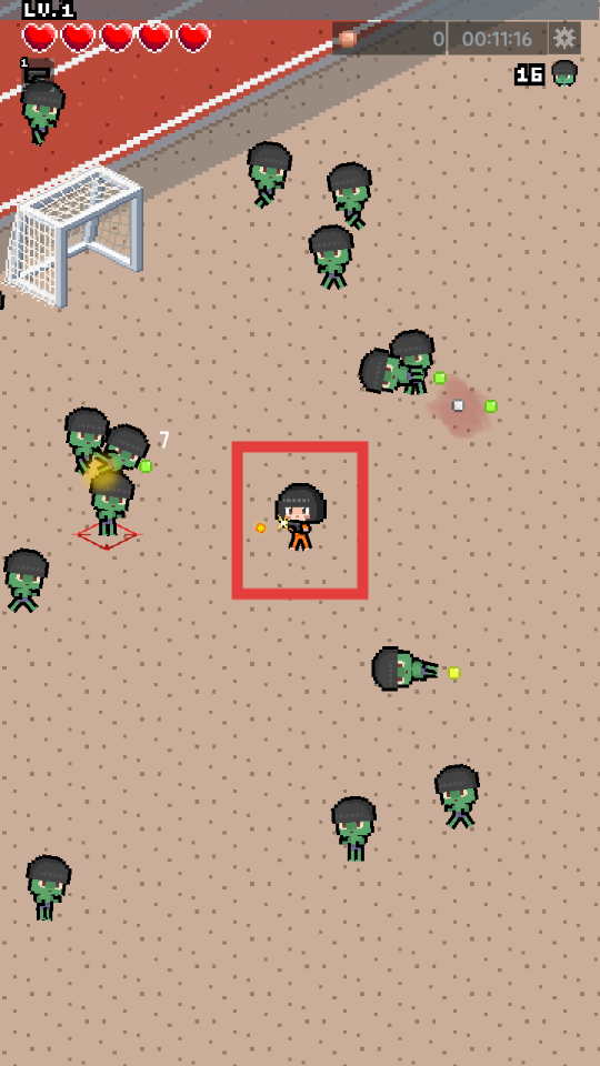 2、进入游戏场景后,操控【红框内】的角色,通过移动躲避僵尸攻击,同时利用武器反击。