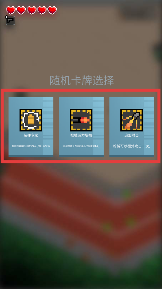 3、游戏过程中遇到【随机卡牌选择】时,从【红框内】的卡牌中挑选,如装弹专家、枪械威力增幅等,提升战斗能力。