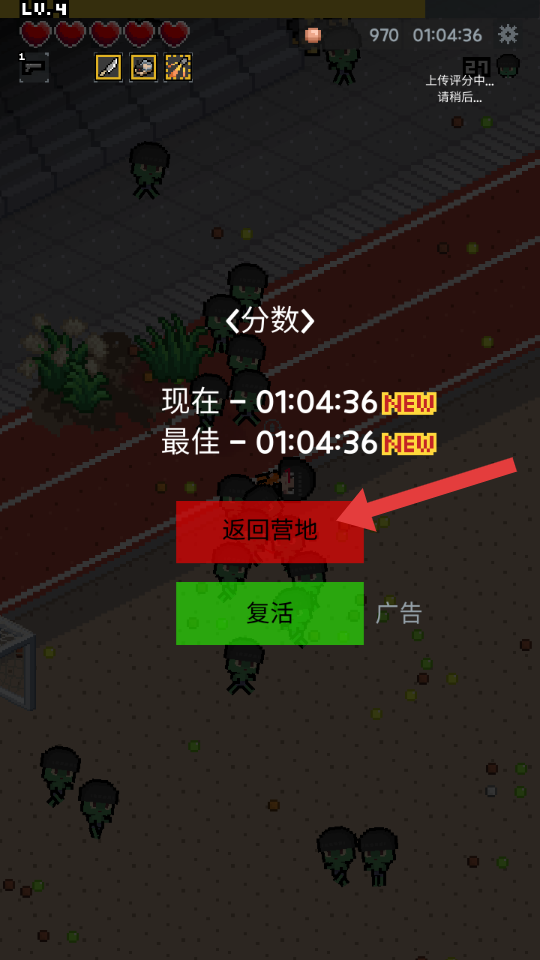 4、当角色生命值耗尽,出现提示时,若不想复活,点击【返回营地】按钮,结束本局游戏并回到营地。
