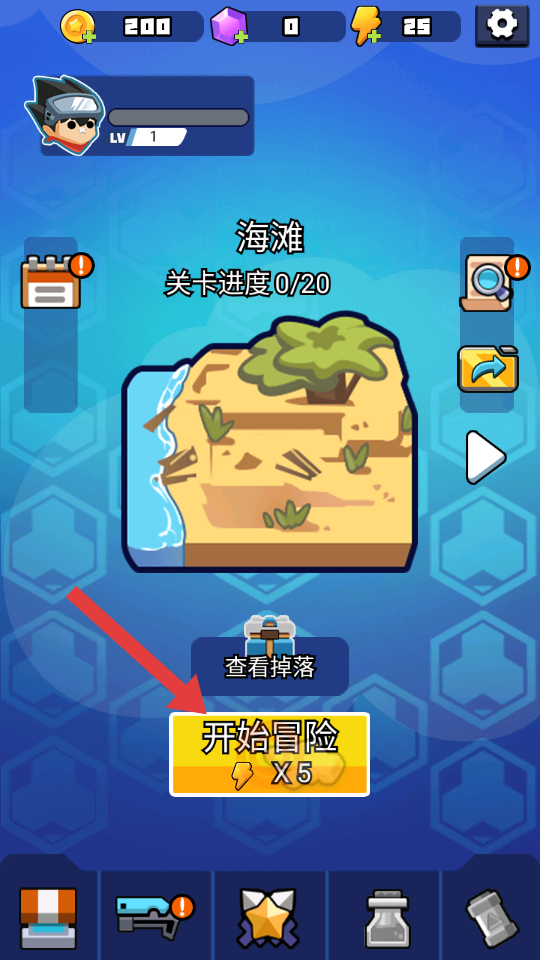 1、在游戏关卡选择界面,确认【海滩-关卡进度0/20】后,点击【开始冒险】按钮消耗对应体力开启游戏。