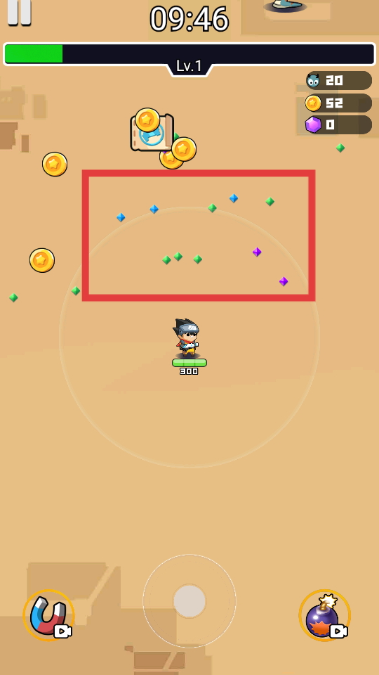 2、进入游戏场景,操控角色移动,收集【红框内】的金币和钻石等资源提升分数和资源储备。
