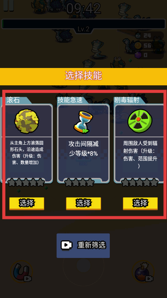 3、当角色升级出现【选择技能】提示时,从【红框内】如滚石、技能急速、剧毒辐射等技能中选择,增强角色战斗能力。