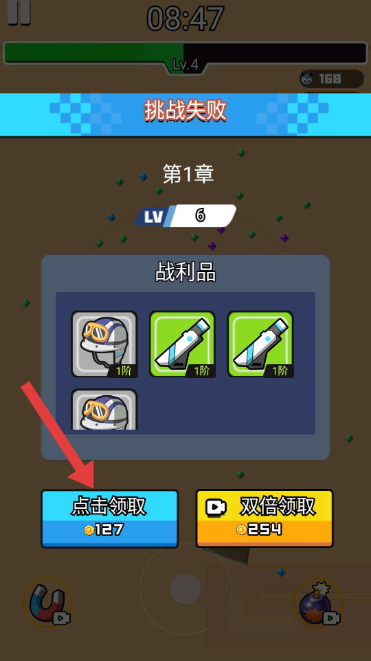 4、挑战失败后,查看【战利品】,点击【点击领取】按钮获取奖励,以便后续更好地挑战关卡。