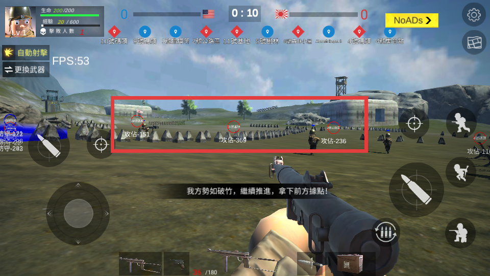 2、进入战斗场景后,留意【红框内】的【攻佔】数值,明确己方和敌方据点占领情况,制定推进策略。