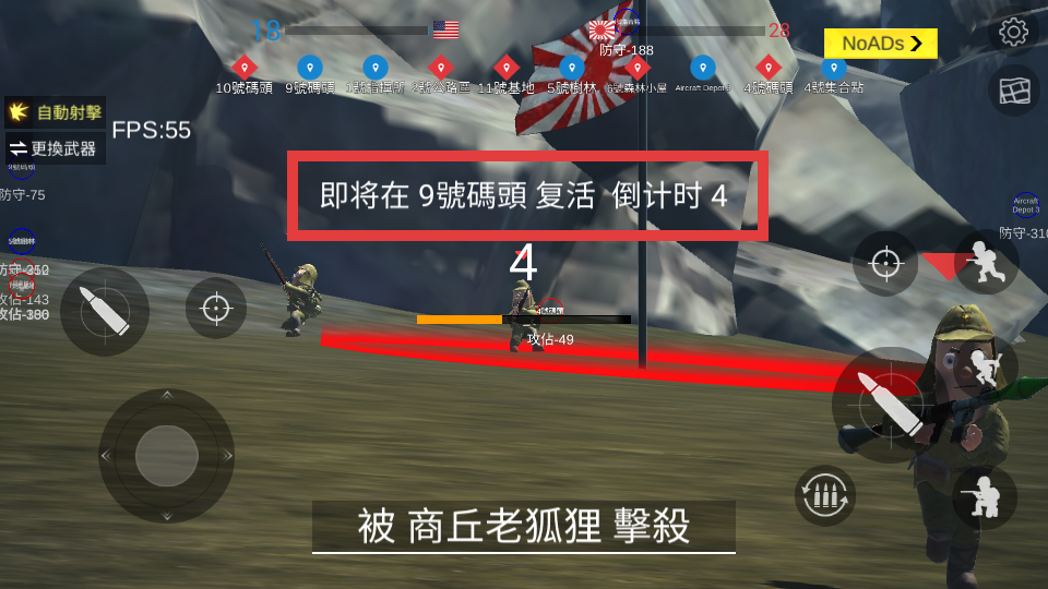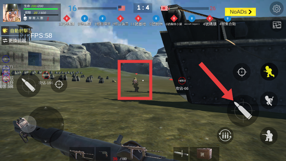 3、遇到敌方士兵时,点击屏幕右侧类似【子弹】的射击按钮,快速瞄准射击消灭敌人。