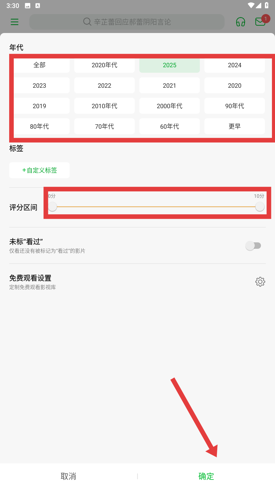 2、在筛选面板里,我们可以选择【年代】和调整【评分区间】,选好后点击【确定】,就能缩小电影范围哦。