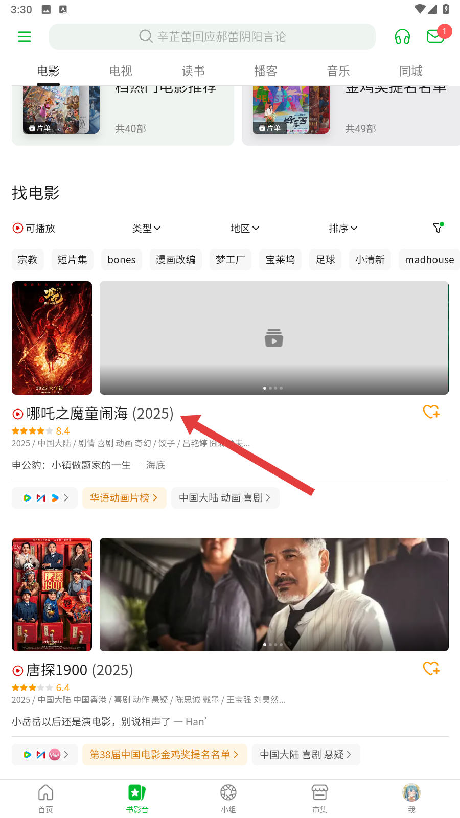 3、筛选完成后,我们点击感兴趣的电影,比如【哪吒之魔童闹海】,进入它的详情页呢。