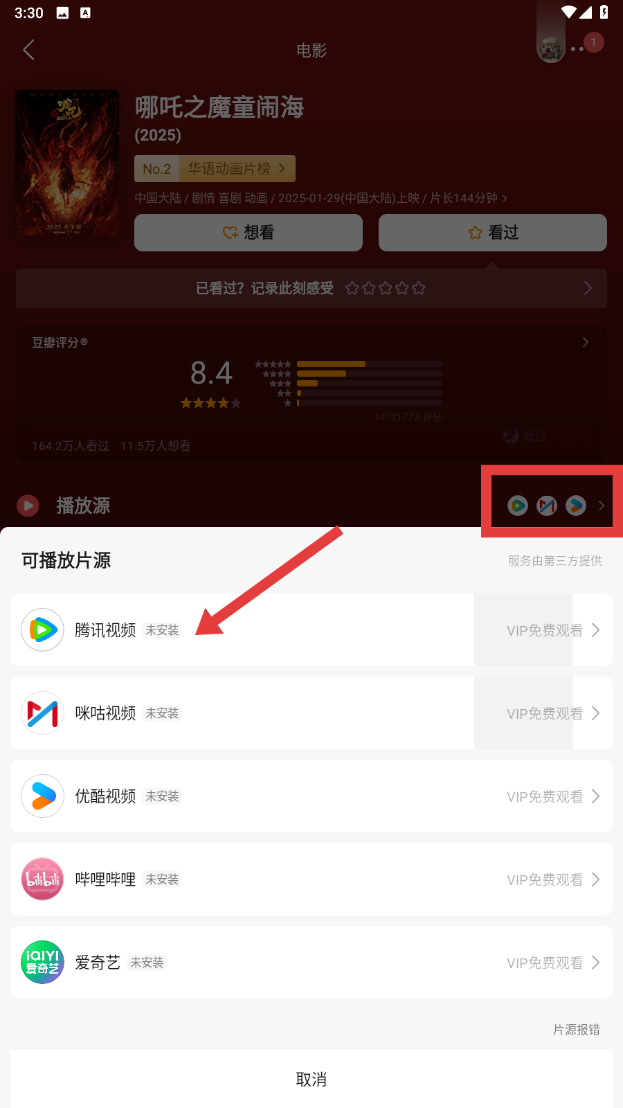 4、在电影详情页,我们点击【播放源】区域,选择像【腾讯视频】这样的平台,就能去观看电影啦。