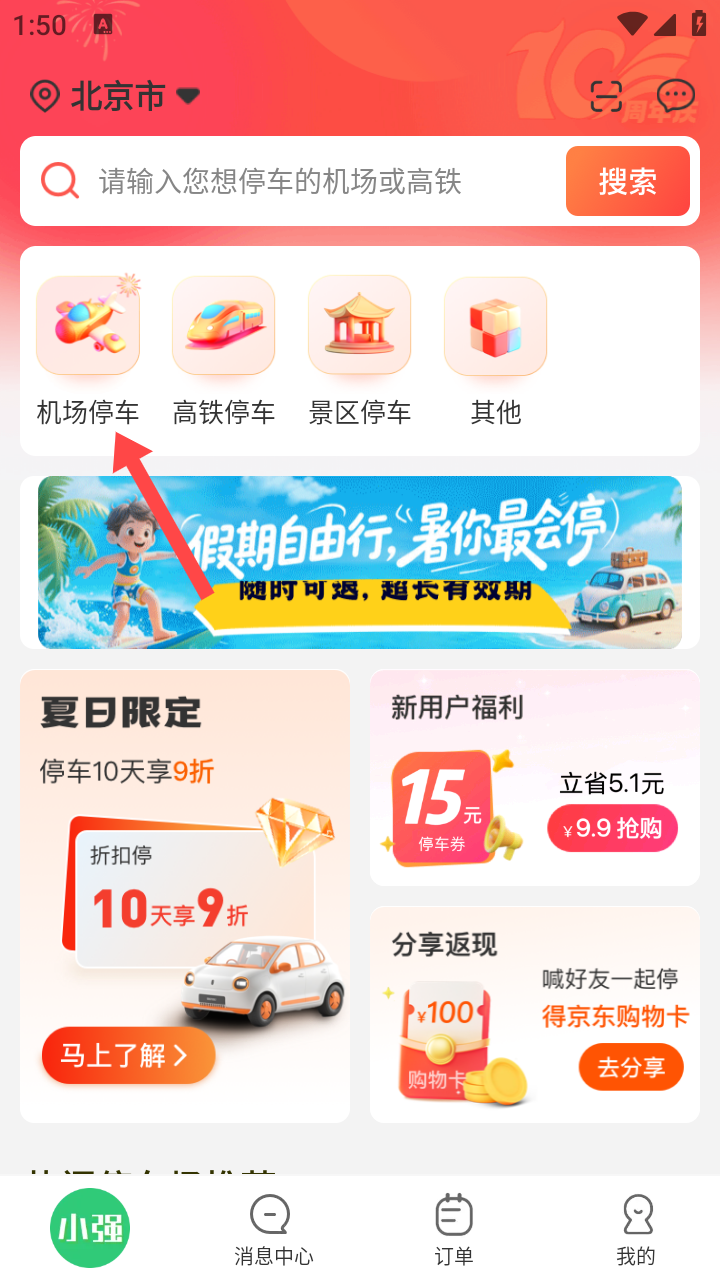 1、打开小强停车APP,点击首页【机场停车】选项。