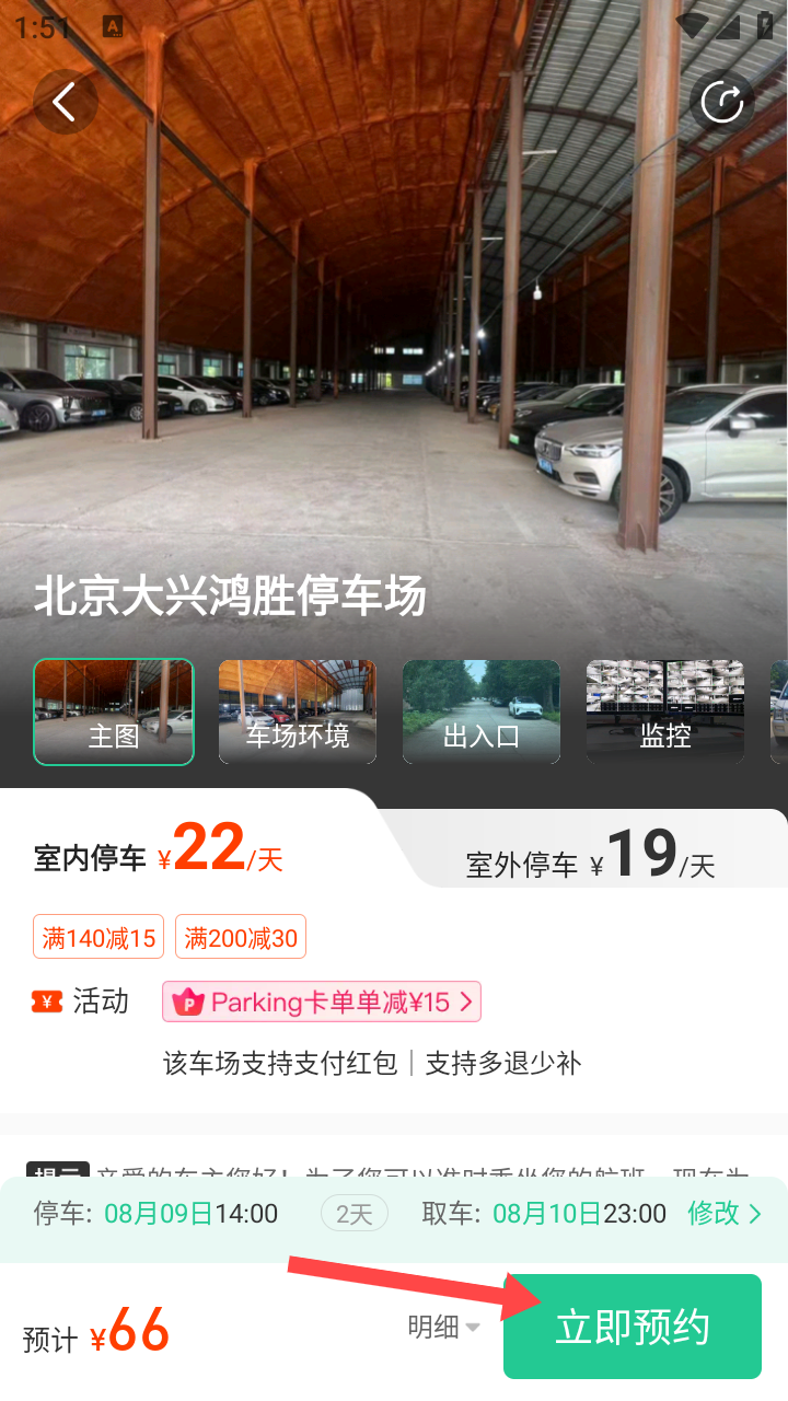 4、进入停车场详情页面,确认停车价格和相关服务信息后,点击【立即预约】,按提示完成车位预订操作。