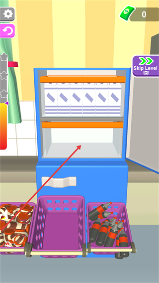 1、关卡目标是整理冰箱,先将下方篮子里的物品(如瓶装物)拖入冰箱空置层,按类别分类摆放以完成整理。