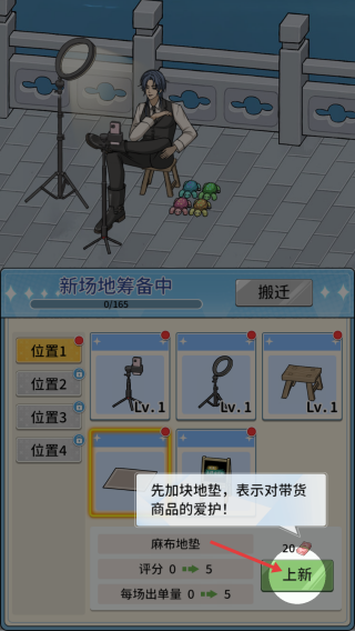 4、点击【上新】添加麻布袋垫,完善直播场地配置,助力带货进程。