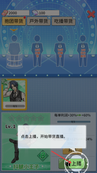 3、点击【上播】按钮,让主播开启直播带货,启动带货经营流程。