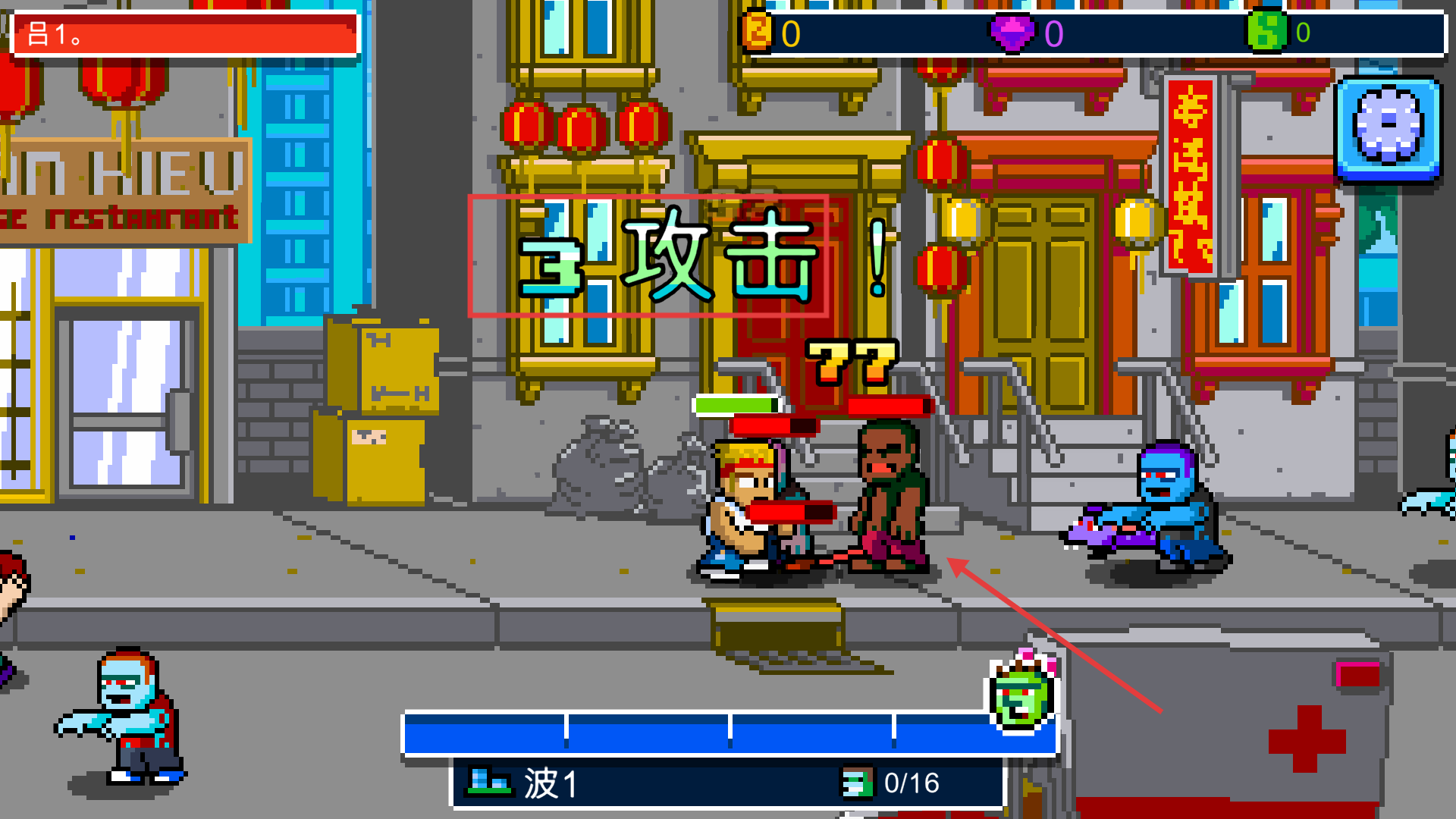 1、初期战斗中,点击屏幕触发【3-攻击】,清理【波1】的僵尸,积累击杀数推进至【0/16】的进度,为后续解锁功能做准备。