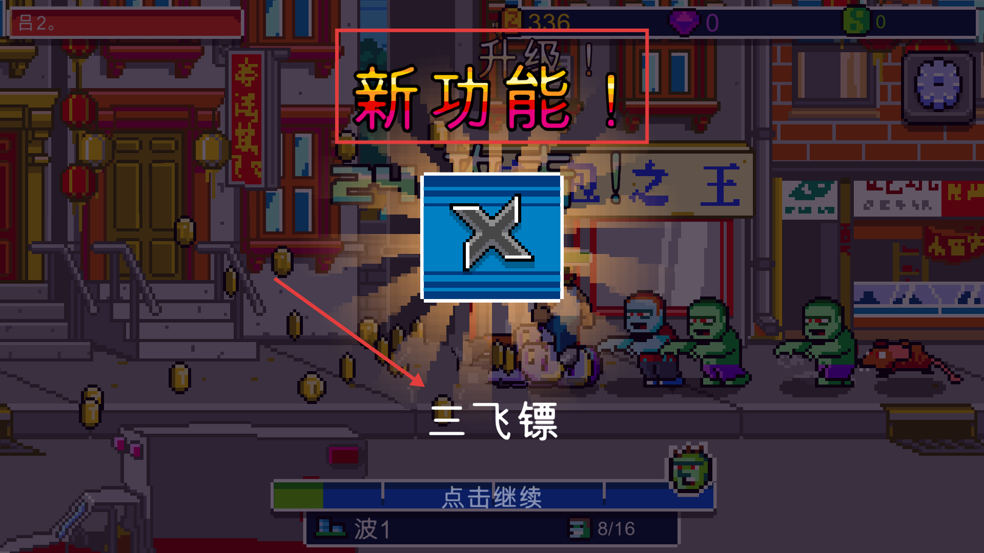 2、解锁【新功能】后,获取【三飞镖】道具,利用它提升清怪效率,同时收集场景中的金币,为装备升级储备资源。
