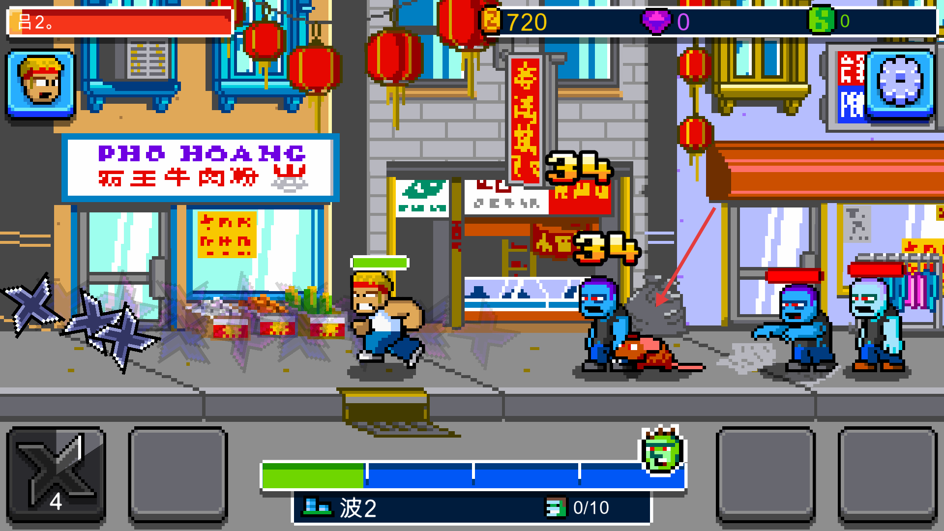 4、进入【波2】后,使用解锁的飞镖技能,对僵尸造成【34】点伤害,快速清理【0/10】的僵尸,推进关卡进度。