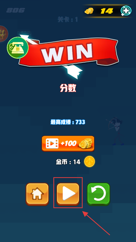 4、通关后点击继续按钮,开启下一关挑战,积累金币解锁技能或购买道具。